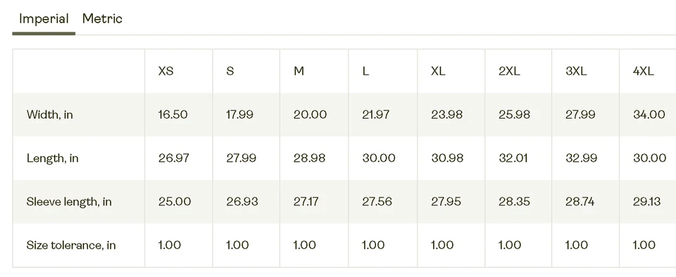 | Sleeve length, in | 26.93 | 27.17 | 27.56 | 27.95 | 28.35 |